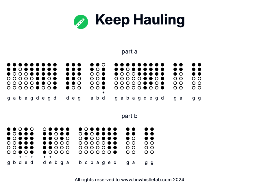 "Keep Hauling" is a lively jig featuring catchy melodies and rhythmic patterns. It's perfect for dancers and showcases engaging variations throughout.