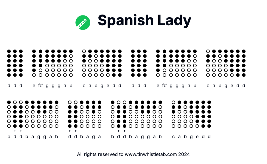 "Spanish Lady" is a lively jig with a catchy melody. Its unique charm lies in the rhythmic pattern and playful sequences, perfect for showcasing tin whistle skills.